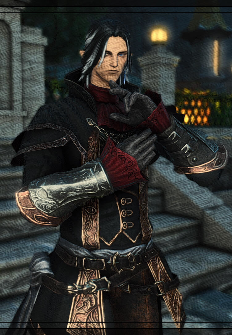 Vallerin was born to a lesser noble house in Ishgard. Not content with the easy life he applied himself to various disciples such as botany, the craft of teas, and swordplay. He quickly distinguished himself through hard work in studies and a natural talent with the blade. As a youth this talent saw him earn praise in friendly competition and as an adult it saw him rise through the ranks of the Temple Knights. Though he never gave up on his study of herbs or the use of them in creating herbal teas.It was during his time as a knight that he met Morgan Haillenarte, one of the youngest daughters of the high house Haillenarte. The two of them quickly fell for one another, finding comfort and happiness with one another even on the icy fields of Coerthas. Soon Vallerin proposed and not long after they were wed.Shortly after their wedding Morgan came across a young Mi'qote in the Brume and in her typical kindhearted fashion could not leave the child to fend for herself. So it was that she brought the child named Koh home to Vallerin and they adopted her. They were a family and together they were happy.... at least for a time.It was during a routine guard mission that Vallerin and Morgan ran afoul the terror of Ishgard, a menacing Dark Knight often referred to as Halone's Fury or Halone's Shadow. This figure tore through the Dusk Vigil. His prowess was frightening and most of the contingent fled or were subdued by his blade. So it was that Vallerin faced the dark figure and tried to hold him at bay skill vs skill. But in the heat of the battle a stray blow brought down half the chamber they were fighting in.... the rubble half burying Morgan in the collapse.Even as the dark figure departed, Vallerin wept. He struggled to do all he could to save his beloved but her injuries were beyond the healing magics of a simple Knight.... in the end she begged him for one last kindness, for a mercy no one else could give her. So it was that Vallerin had to watch his beloved die not the slow death the Shade had bequeathed her, but rather a swift one by his own blade.That night changed him. A night where he watched his light leave this world... and then had to explain her absence to their daughter. A night where he case aside the sword and shield no longer seeking to protect, but instead taking up a greatsword and seeking to avenge. The world was unjust, the rules only applied to those who could not break them by force of will or sheer strength... and he would have none of it.For his failure at the Vigil he was stripped of his knighthood, and without the influence of his wife and her house his family insisted he choose between station and his adopted daughter. This was the first test of his resolve, a test that saw his family fall ill even as he was nursed through illness by his daughter.... and though voices whispered throughout the nobility of poison none could ever prove anything. So it was that he ascended to control of house Rillemont.With newfound influence he began to search for the shade who had wronged him and Koh even as he trained tirelessly to surpass his limits. By the time he found the man and the prisoner he had saved it was now Vallerin who was the terrifying figure stalking his prey. In fact when they finally clashed if not for Koh staying his hand he might have ended them both then and there.But such vitriol and venom seldom breeds happy endings and so it was that he found himself alone on this hunt as his daughter developed doubts. But he could not turn away this late in the hunt.... and so instead challenged them to do battle with him once more. He poisoned himself though determined to see his daughter at least freed of this burden even as he planned to put an end to those who had brought him so much pain.But fate is a funny thing. The man he hated and hunted was full of his own regrets, and he understood Vallerin's path better than most. It was this same figure who in the end spared Vallerin's life, fought beside him to subdue a threat to that they both held dear, and then took Vallerin in... nursing him back to health.Now Vallerin struggles to find his place. Still determined to right the wrongs of the world but not sure how to do so. He offers aid to the man whom he feels he owes a great debt when he can.... but for the most part has shifted his focus to his daughter and helping them both find their place in this new and changing world. An effort aided by his recently restored Knighthood and Title. Though he does not cater to the politics of Ishgard his station affords he and his daughter a certain level of freedom.... freedom they have used to travel. It was in those travels that they perhaps found something they never knew they were looking for. A childhood friend turned something more for Vallerin and perhaps a confidant or potential maternal figure for his daughter.... what the stars hold for them next only time will tell.